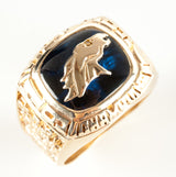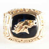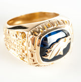 Are you or someone you know a die hard Denver Bronco's fan? You are in luck! This 14k yellow gold cushion cut lab created sapphire and diamond fan ring is just what you need. With a dazzling diamond accenting the broncos' eye and a beautiful blue lab created sapphire, this ring to sure to make other Bronco fans jealous with envy.
