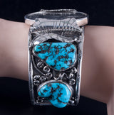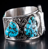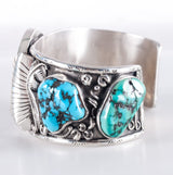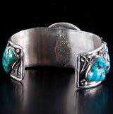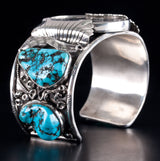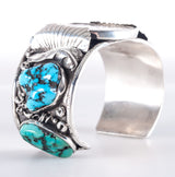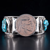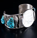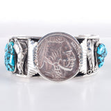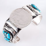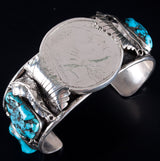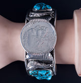Vintage 1970s Sterling Silver Navajo Indian Head Coin Turquoise Cuff Bracelet