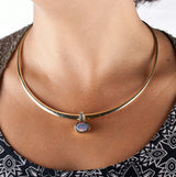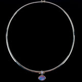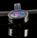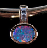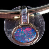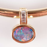 This memorizing 18k yellow gold opal and diamond pendant with a 14k omega is truly a stunning piece. Lightening ridge opal in Australia produces some of the most stunning opals in the world. Catch attention and compliments with this piece.