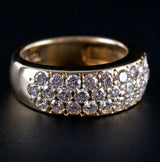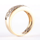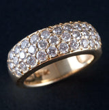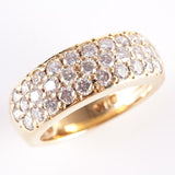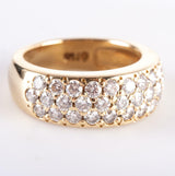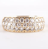 This classic 18k yellow gold diamond band is perfect for any occasion whether it be a wedding or anniversary. The round cut diamonds, set in three rows in gold, the diamonds in the band make this ring hard to pass by. Wear it at home or out, let the diamonds cast little rainbows where ever you go.