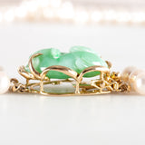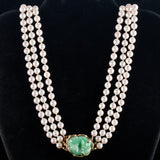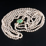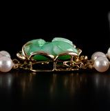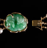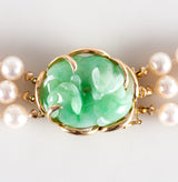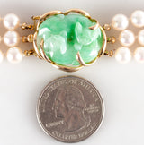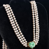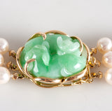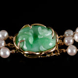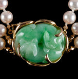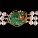 Vintage 1970s 14k Yellow Gold Three Strand Pearl Necklace With Jadeite Cat Clasp